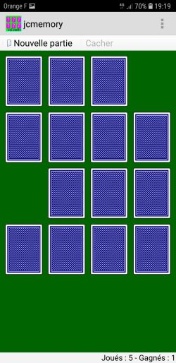 JcMemory - logiciel de jeu de mémoire pour smartphone et tablette android et ordinateur sous linux et windowsDéveloppé par J.Coron avec Qt Open Source Edition - versions 5.12.2 pour android - 5.11.3 et 4.8.7 pour linux 64 bits - 4.8.6 pour linux 32 bits - 4.3.3 pour windows