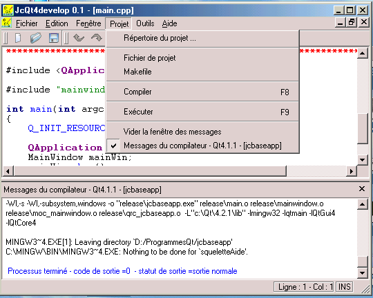 Voici une image de la fenêtre de JcQt4develop-0.1 - version francisée :